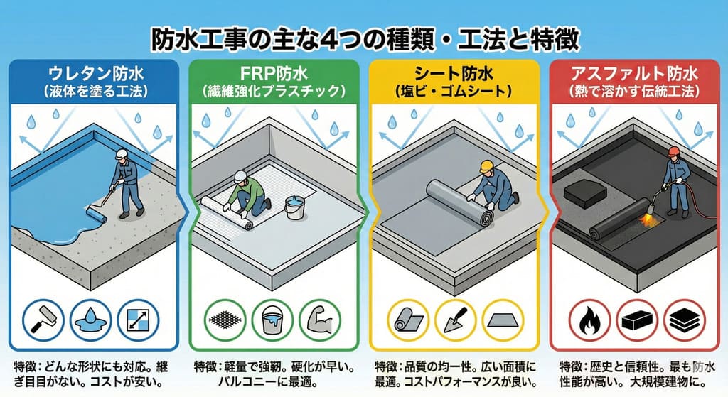 主にウレタン防水、シート防水、アスファルト防水、FRP防水の4つの工法があり、建物の状況や用途に応じて最適な工法を選択します。