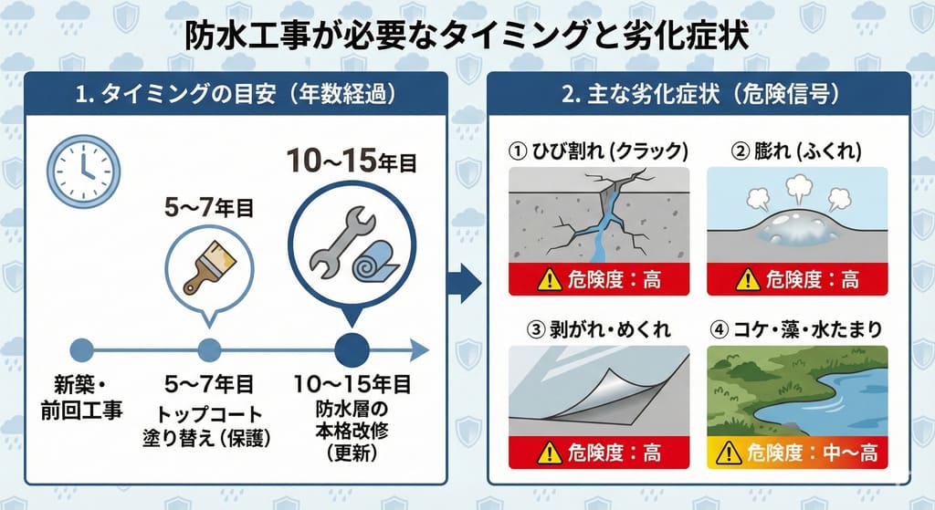 これらの場所は常に雨や紫外線にさらされているため、防水層が劣化しやすい環境にあります。