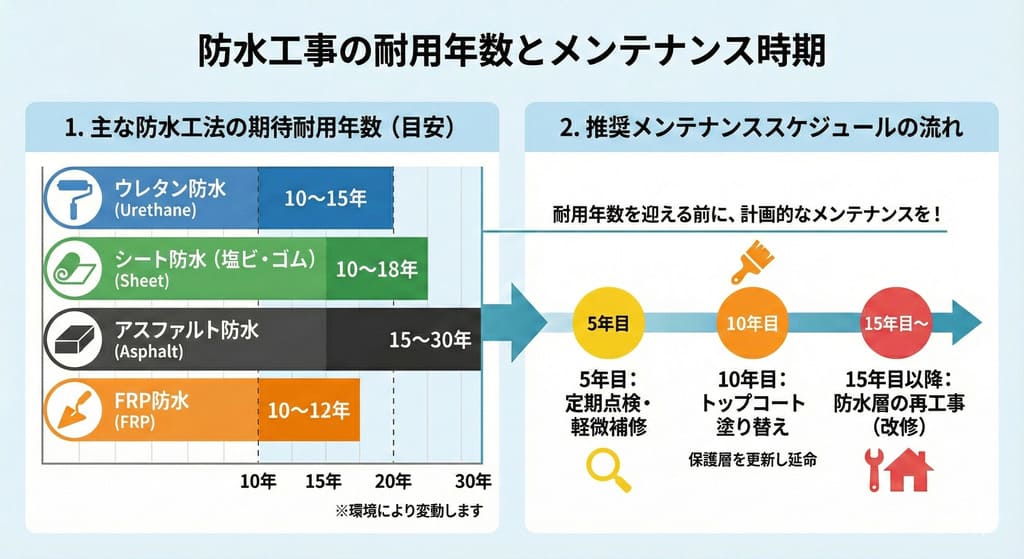ウレタン防水は10〜15年、シート防水は12〜18年、アスファルト防水は15〜30年、FRP防水は10〜12年が一般的な目安です。