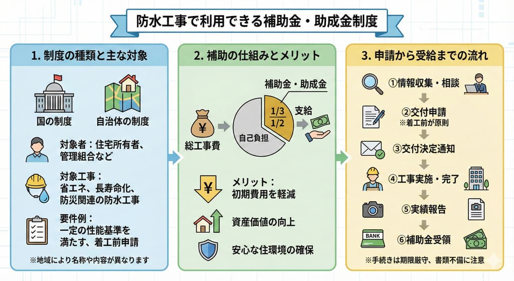 防水工事は費用負担が大きいため、国や自治体の補助金制度を活用することで、経済的な負担を軽減できる可能性があります。