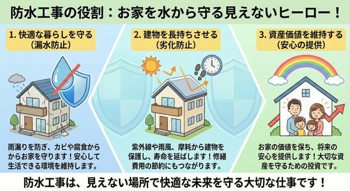 防水工事は、建物を雨水から守り、長期間にわたって安全で快適な環境を維持するために欠かせない工事です。
