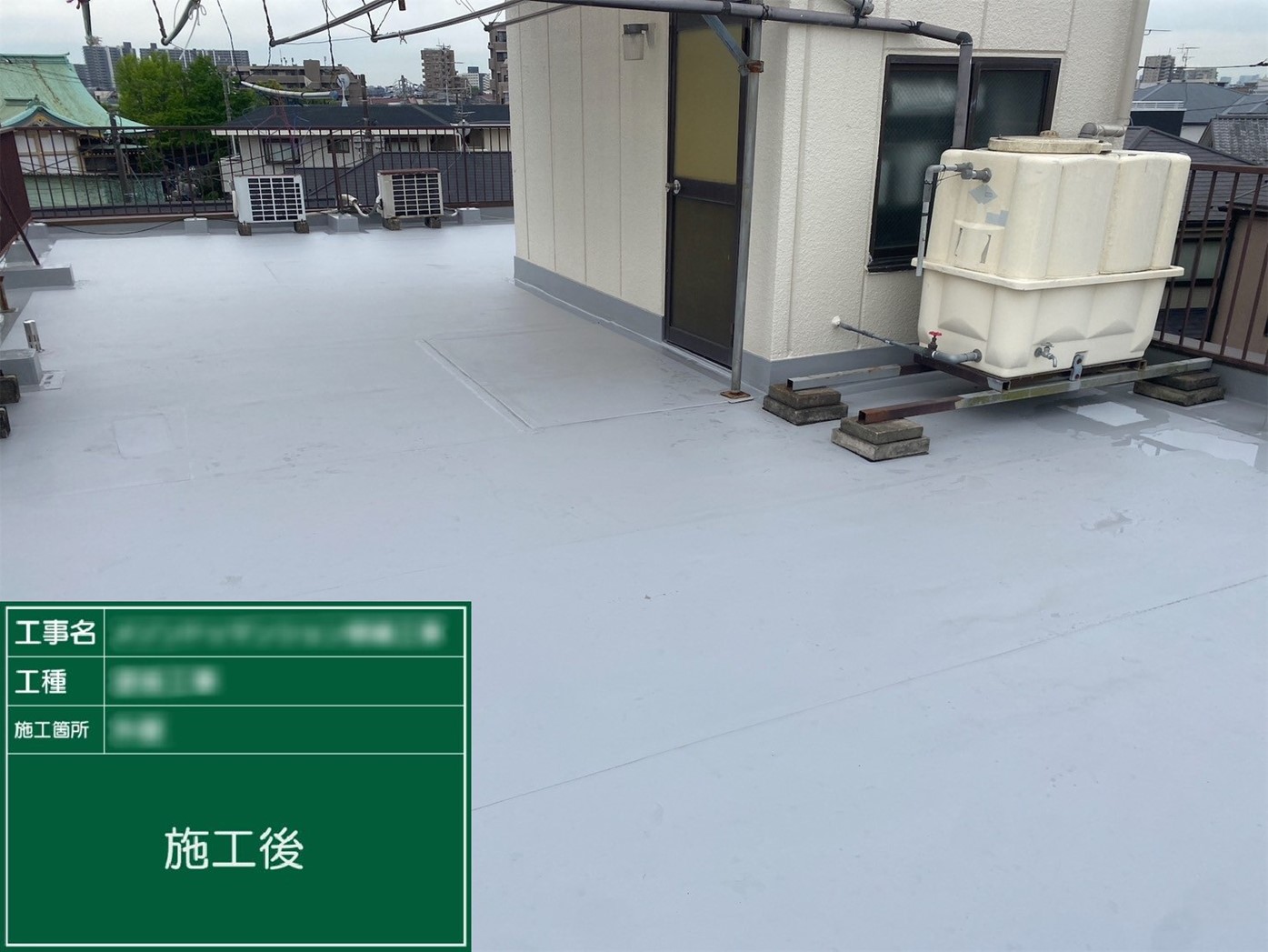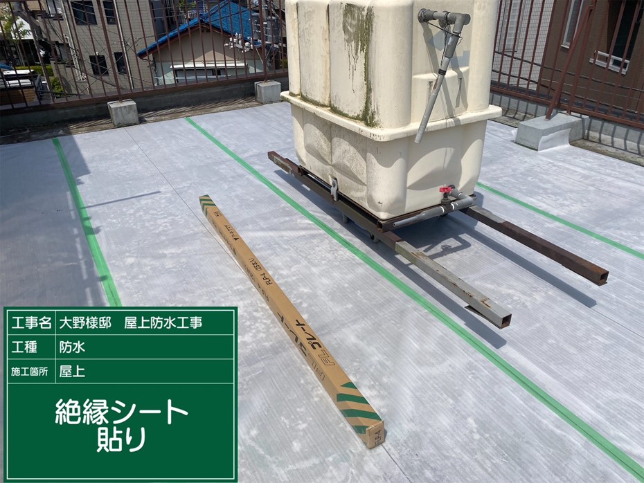 熊倉の声:ありがとうございます。そういって頂けてよかったです。一応出入口と貯水層タンクの下も塩ビシート敷きこんでおりますので特段問題はございません。それ以外の部分もしっかりと防水層はつくれておりますので問題ございません。もし何かありましたらご連絡いただければ対応させていただきますのでよろしくお願いします。雨漏りに関しても今後またあるようでしたらご連絡ください。
