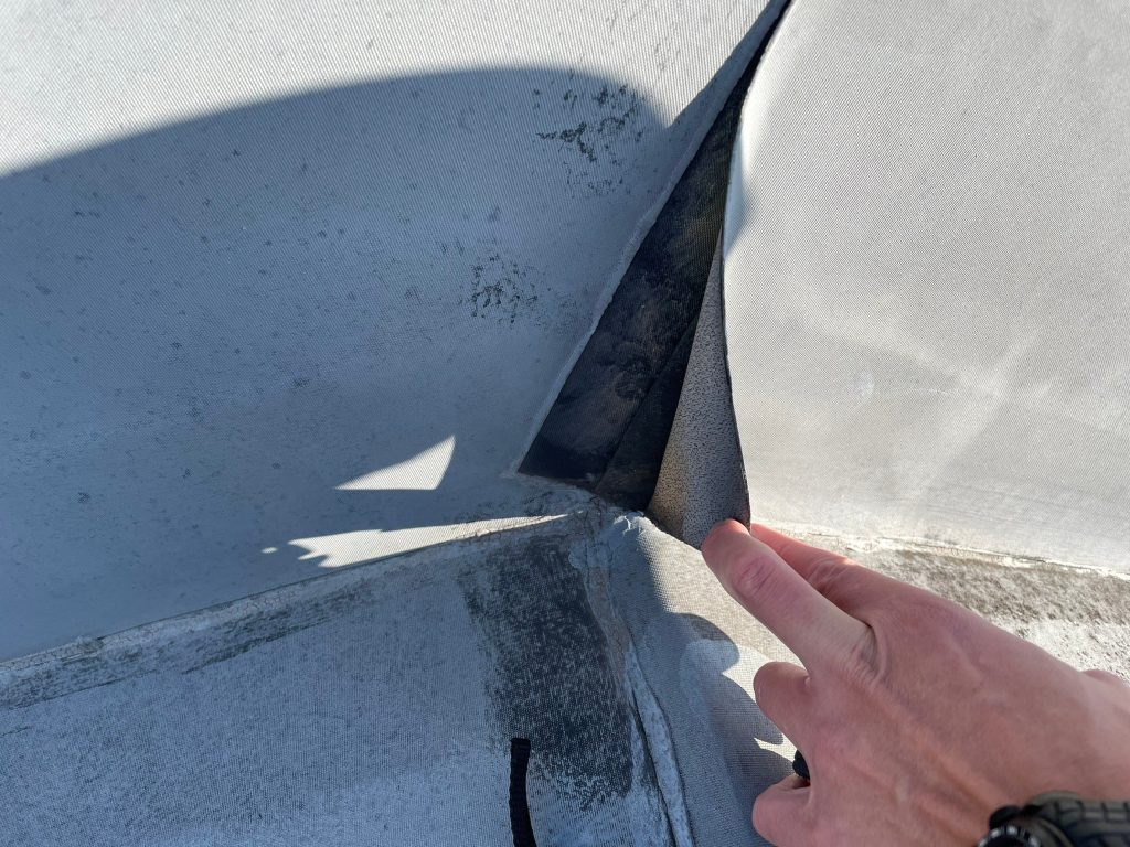 蓼沼の声:えっと、工事内容の確認なんですがゴムシートを撤去後にウレタン塗膜防水の通気緩衝工法で施工します。