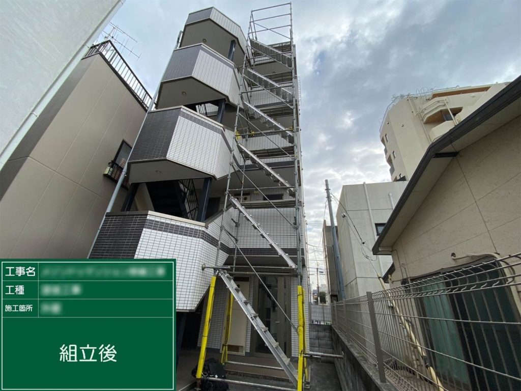 使用材料や色(グレー)、足場の設置位置を確認。
