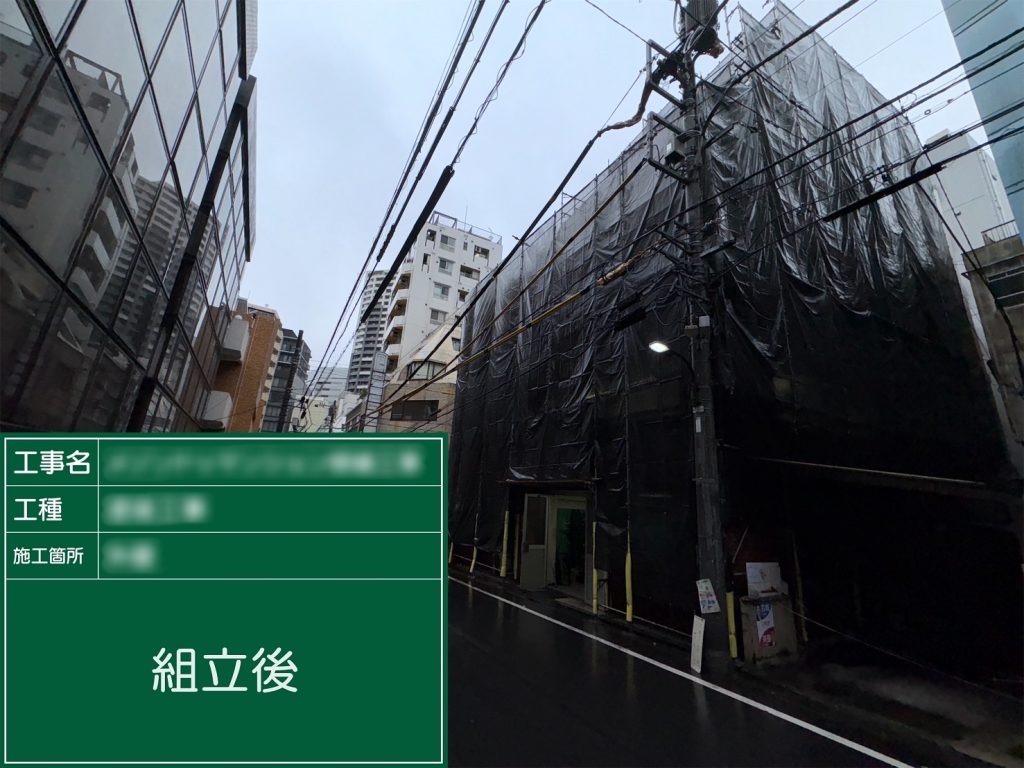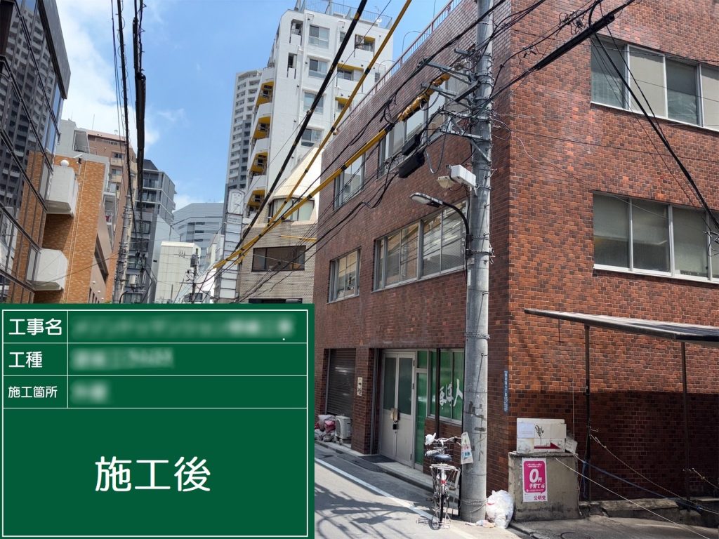 本事例は、新宿区にあるビルの防水工事・外壁塗装工事に関する記録です。近隣挨拶に伺った際、偶然オーナー様から「テナントで雨漏りが発生した」と相談を受け、現地調査・図面確認を実施。シーリングの劣化やタイルのひび割れなど原因を特定し、屋上ドアの交換提案も行いました。足場のスペース制約により一部はロープ作業を提案し、全面施工と三面施工の2パターンで見積を提出。説明では実数精算のリスクや優先順位提案も含め、丁寧に対応。内容に納得され、契約に至りました。その後、現場管理者による打ち合わせで色決めやタイル・雨樋の仕様を決定。工事中は進捗報告を適宜行い、下地補修の追加費用も迅速に説明し了承を得ました。施工は足場組立、シーリング、洗浄、塗装、防水の順に進み、細かい要望(看板撤去・ライト撤去)にも柔軟に対応。検査・清掃後、屋上ドアの開閉改善や防水の仕上がりにも満足いただき、無事引き渡しとなりました。