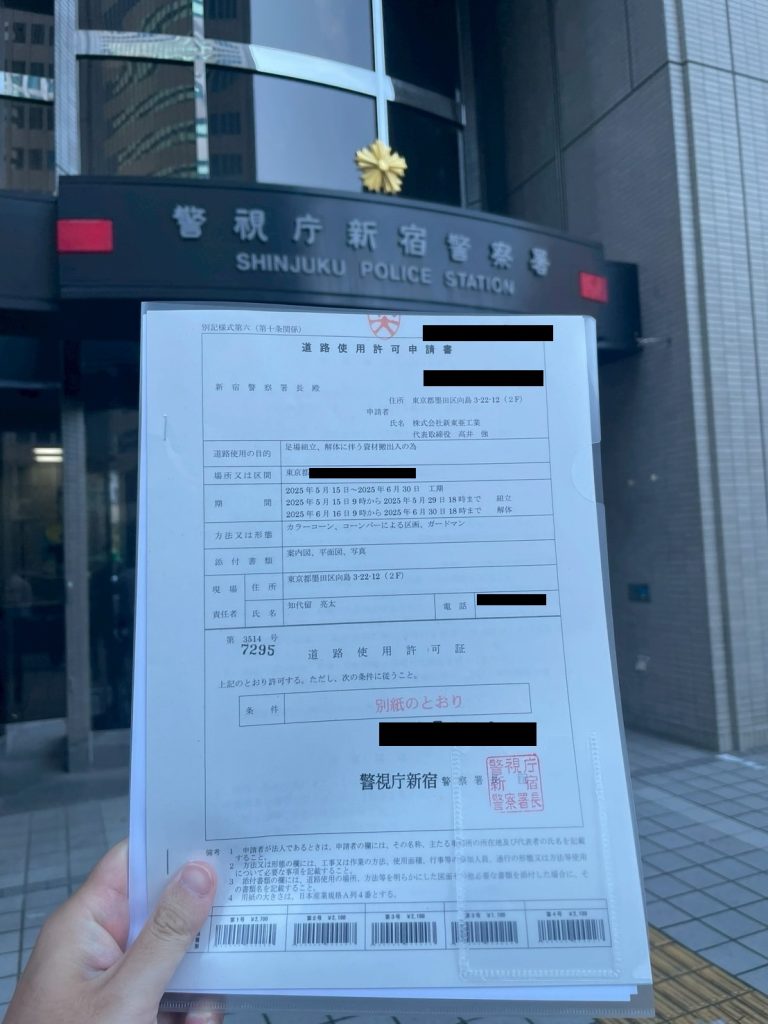 駐車させていただきます。こちらは警察の方に申請をさせてもらって承認は得ているのですがご迷惑になってしまうので近隣の方にはご挨拶をさせて頂いている状況です。