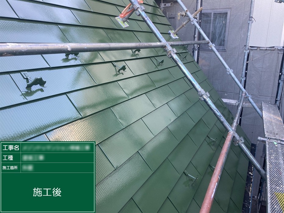 外壁は今の雰囲気を活かした白系、屋根や鉄部にはお客様のこだわりで「落ち着いた深緑」を採用し、全体のバランスも一緒にご提案。