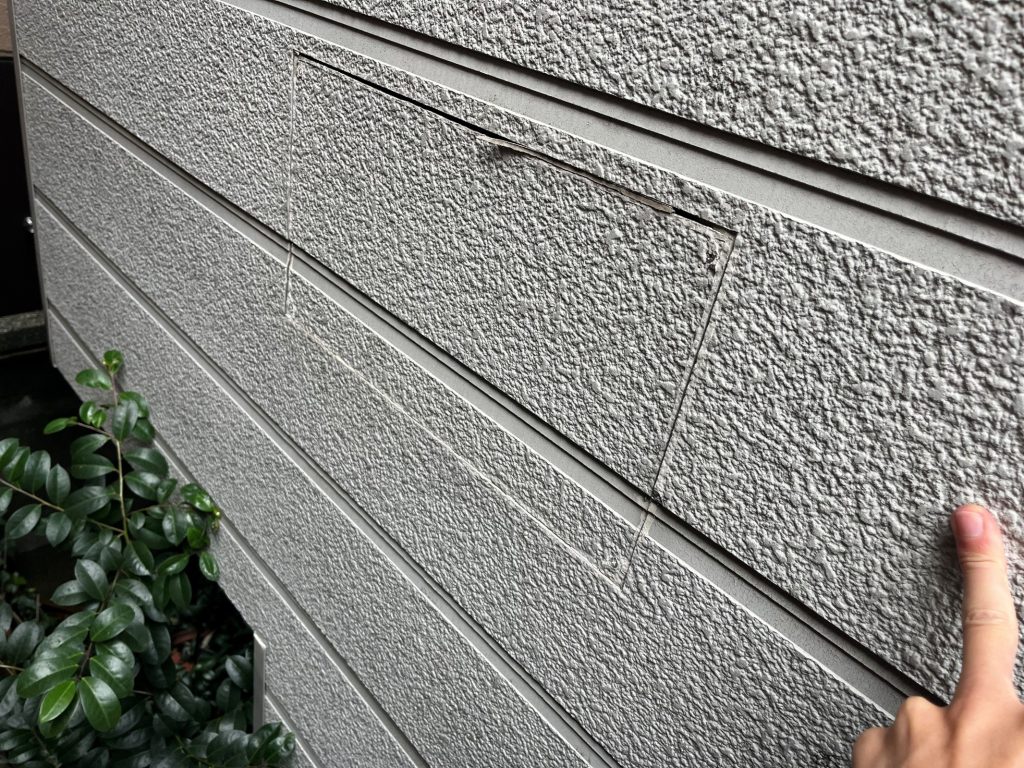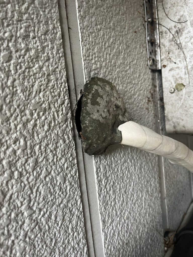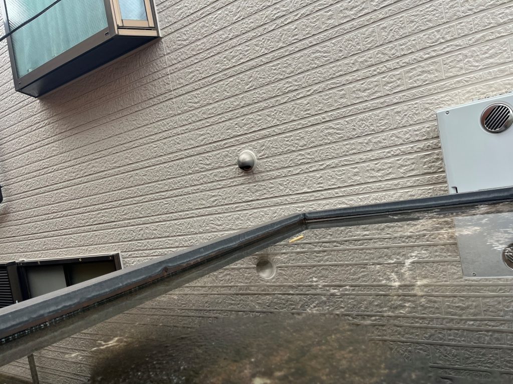 高井の声:今外壁の方見させてもらったんですが、まず庇のところ雨水が溜まってて、流れてないんですよ。ドレンにゴミがたまってるのか全く機能していません。あと外壁なんですが、サイディングの補修した跡だと思うんですがシールが切れているのとエアコンの配管廻りのパテも痩せてしまっていて貫通部の処理もしないといけません。