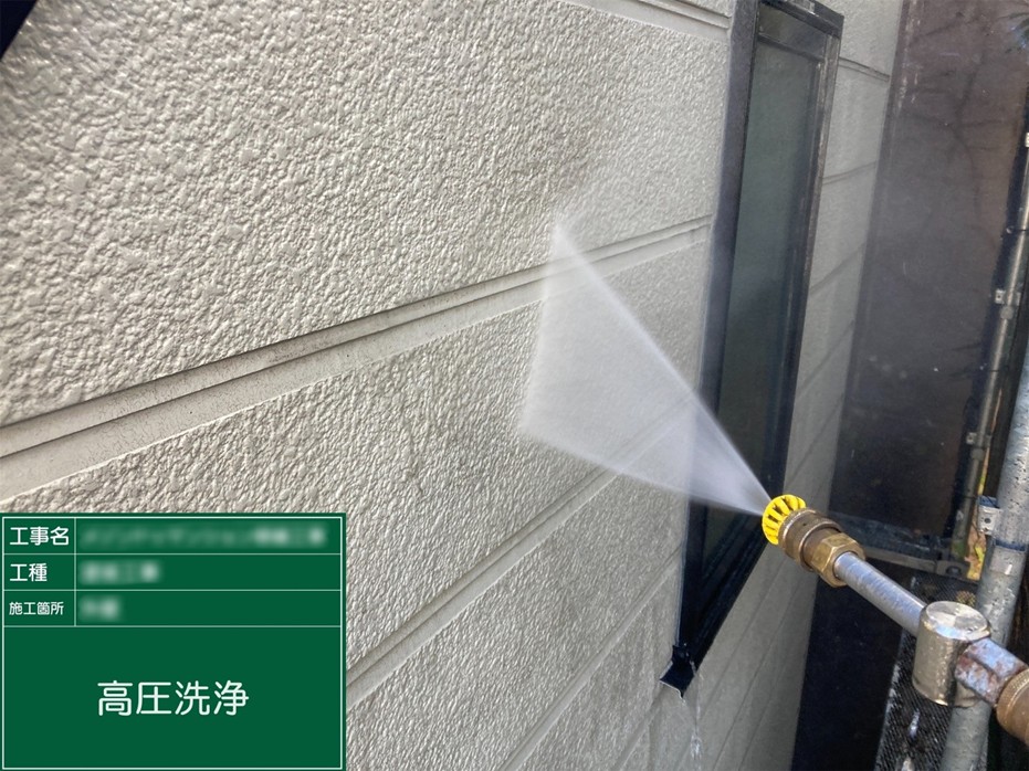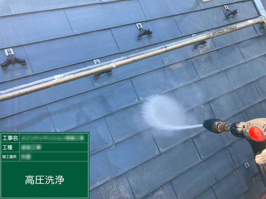 高井の声:えーと、、、次が洗浄工事になります。塗装面と防水面を高圧洗浄で洗います。結構苔とかも生えていたので洗浄で落とします!