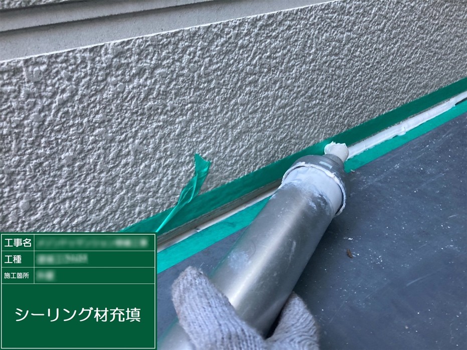 シーリング工事では、打ちたての注意点を丁寧に説明し、目印のテープで安心配慮。