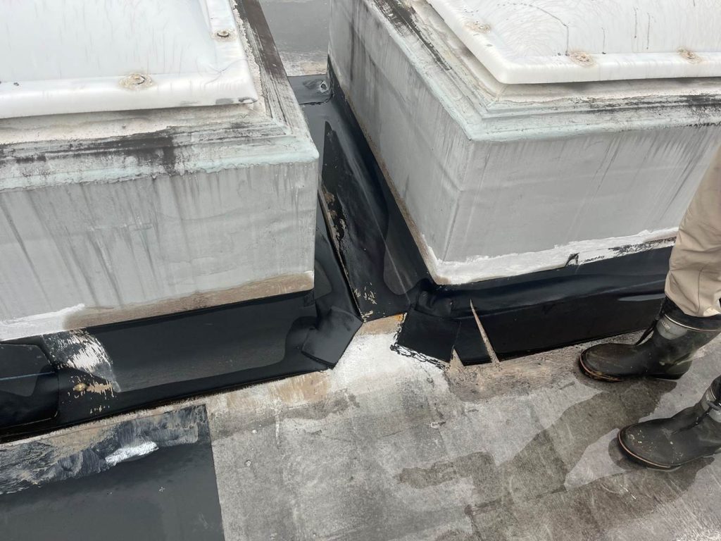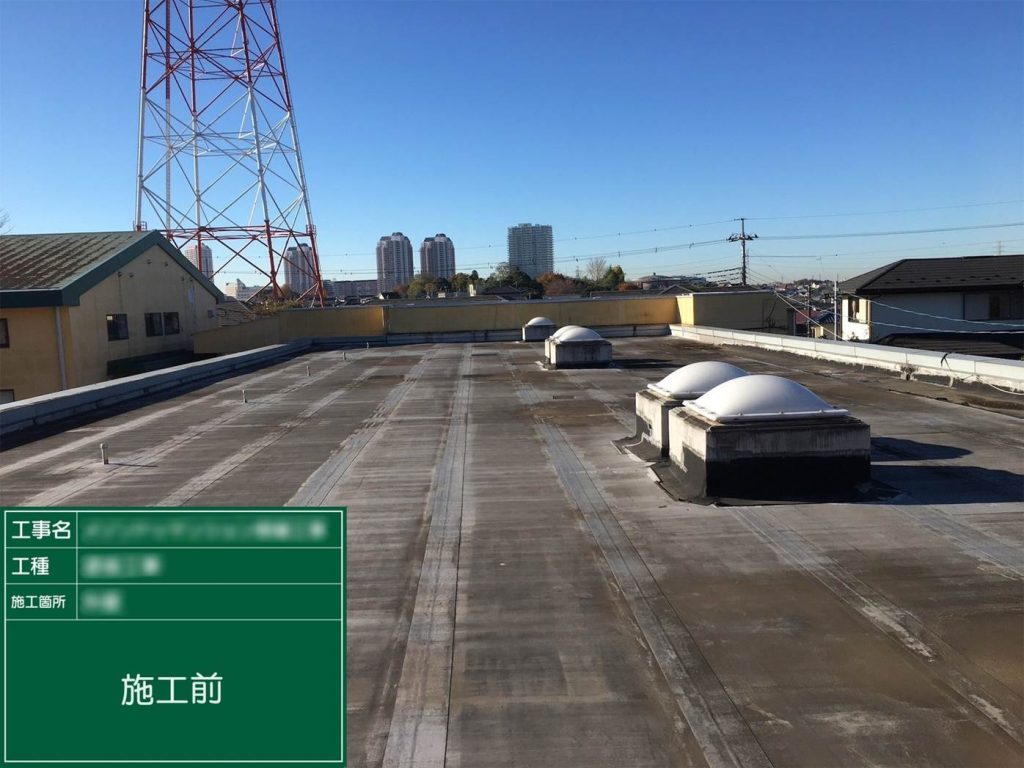 高井の声:次のページが防水工事になります。屋上の真ん中から勾配が低い面のみ施工する仕様になっています。現地調査の際にもお話したようにまず既存のゴムシートを撤去してから下地の補修をして絶縁マットを敷いてから塩ビシートを敷きます。