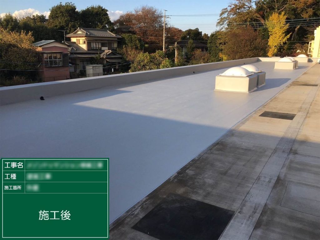 施工範囲は「屋上中央から勾配が低い片面のみ」で、事前の計画通りに問題がないことを双方で再確認。
