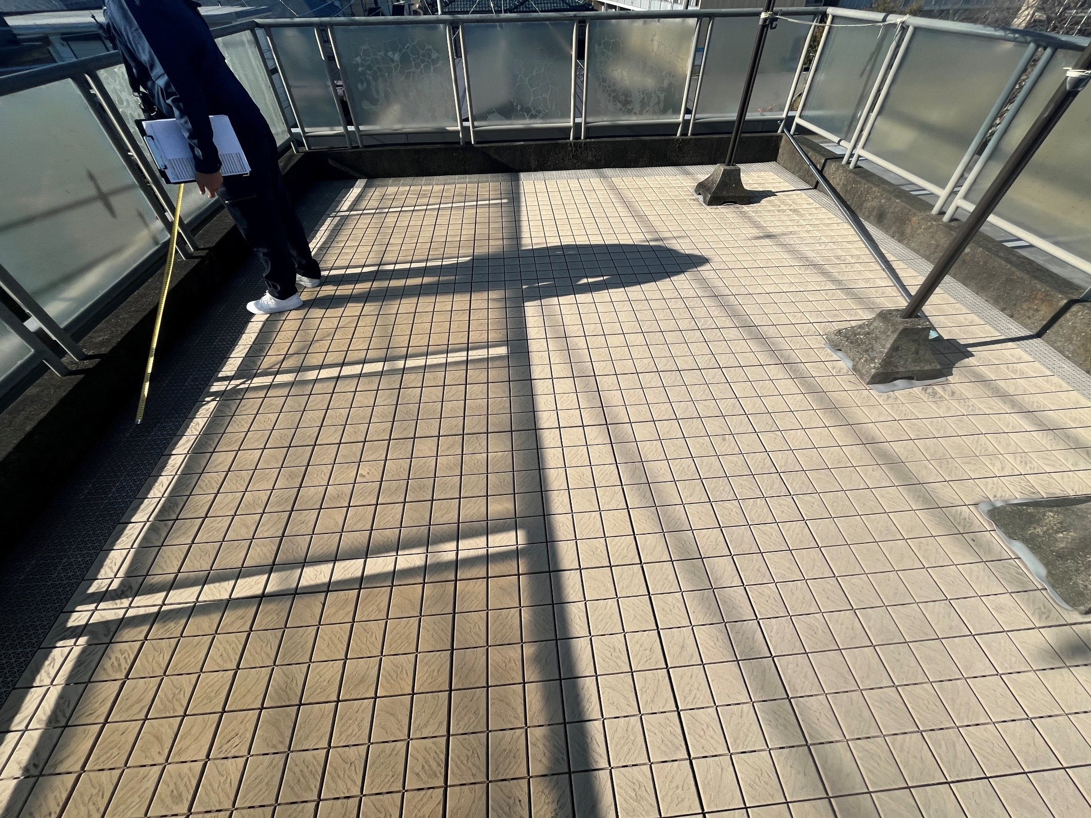 現地では屋上・バルコニーともにタイルブロックが敷かれており、「できればそのまま残したい」というご要望を受け、半面ずつの施工提案を実施。
