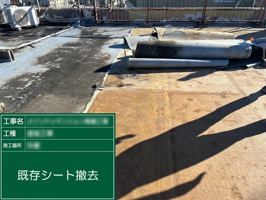 既存の防水層は複数層が重なり、傷みも激しい状態だったため、全面撤去のうえで新たな防水層を形成。