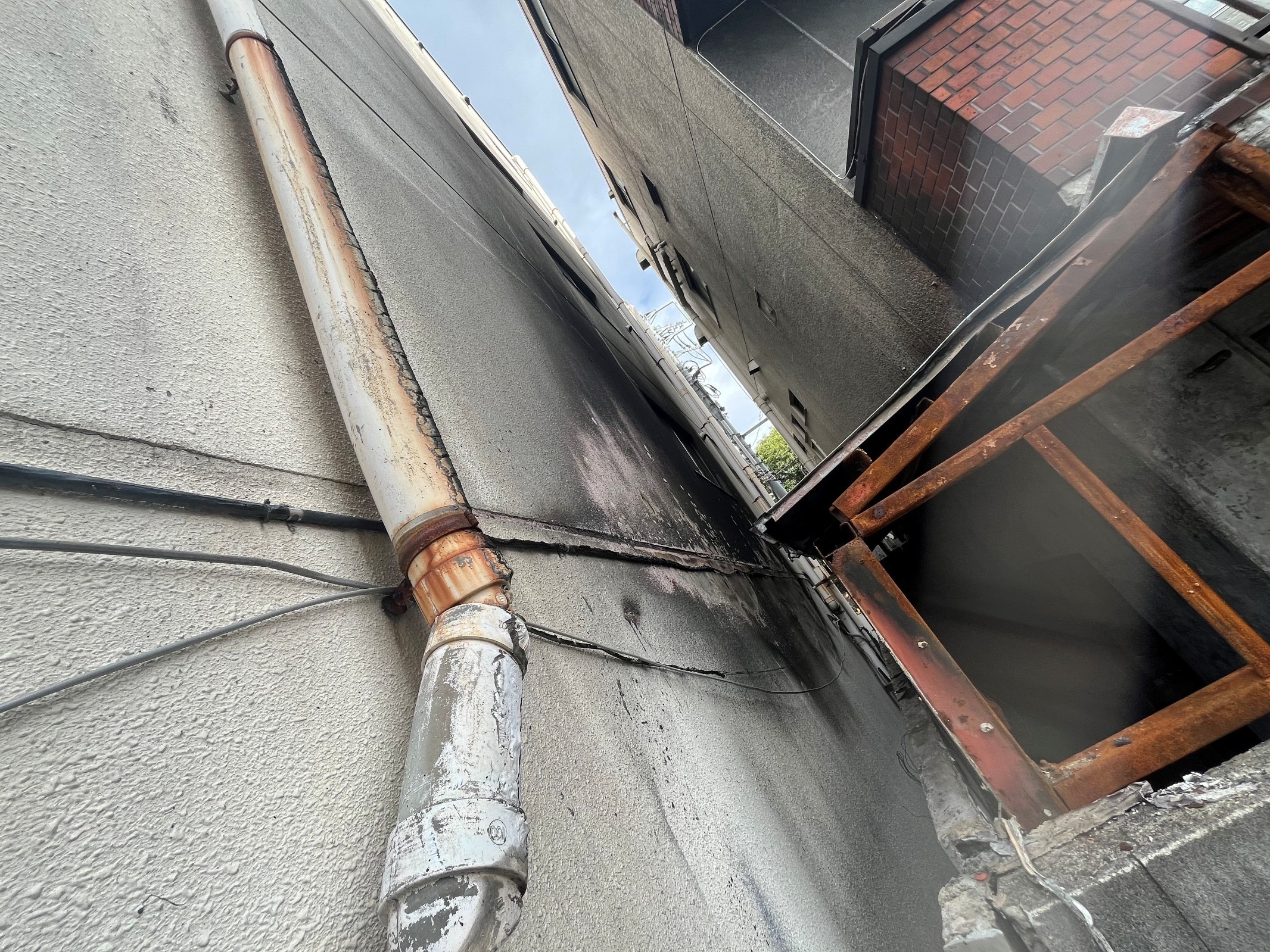 高井(営業)の声:火災の被害箇所はこちらですね。雨樋や外壁のひび割れも併せて調査し、屋上防水も必要です。