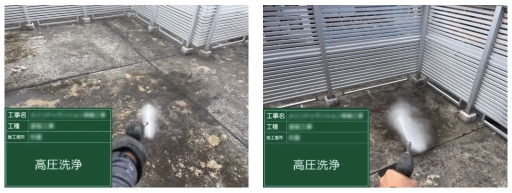 施工前の準備として高圧洗浄を実施し、表面の汚れや既存防水層の劣化を徹底的に洗い落としました。