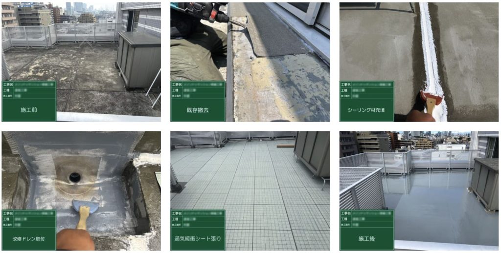 | 主な工事内容 | ・高圧洗浄 ・既存長尺シート撤去 ・カチオンモルタル下地補修 ・ウレタン塗膜防水(通気緩衝工法) ・長尺シート敷設 |