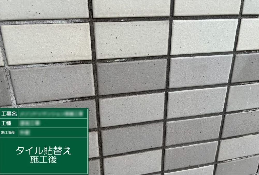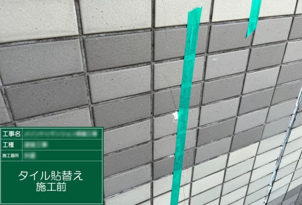 | 下地補修工事 | タイル貼替え(50角・45二丁掛) タイル浮き・目地欠損・ひび割れ・ モルタル浮き・欠損・鉄筋爆裂などの補修 |