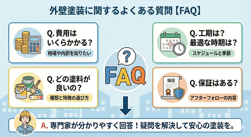 外壁塗装についてよく寄せられる質問をまとめました。疑問や不安の解消にお役立てください。
