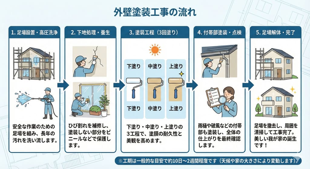 | 高圧洗浄 下地処理 | 約5~10% | 汚れ・カビを除去し、塗料の密着性を高める |