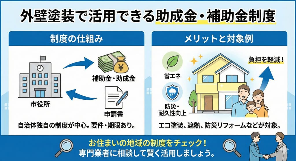 外壁塗装には、国や地方自治体の助成金・補助金を活用できるケースがあります。