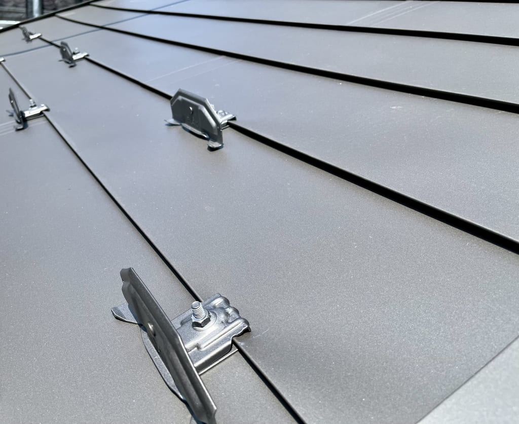 例えば、スレート屋根では、スレートの重なり部分に差し込むタイプの金具を使用しますが、金属屋根では、屋根材の凸部を挟み込むタイプを使用します。