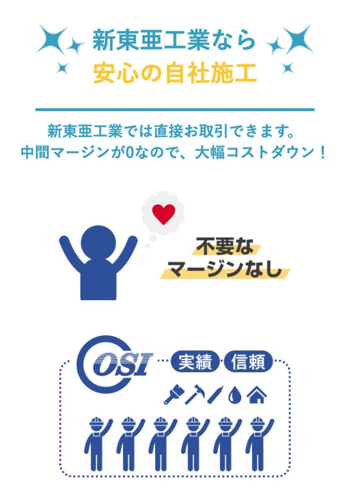 新東亜工業では、お客様と直接対話し、材料、足場、施工まで全て自社施工で行なっております。